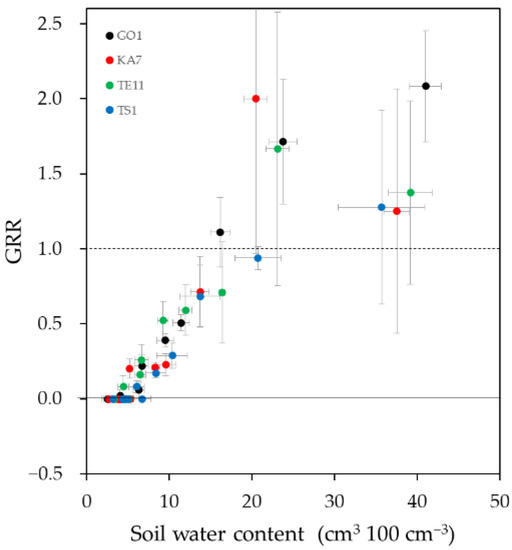 Figure 5. Relationship between the soil water content and growth rate ratio (GRR). Black, red, green, and blue symbols correspond to the clones GO1, KA7, TE11, and TS1, respectively.