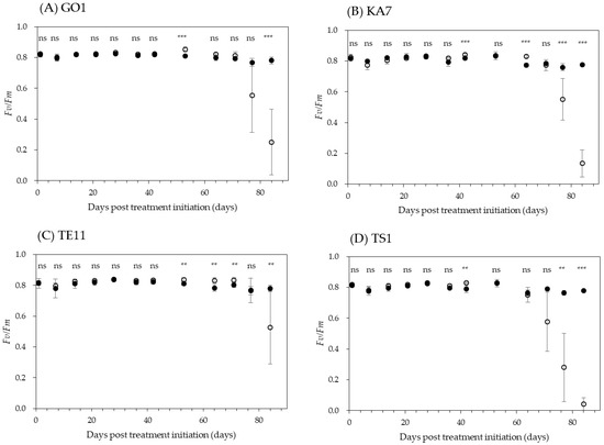 Figure 6. Temporal changes in the maximum photochemical quantum yield of photosystem II (Fv/Fm) in the four clones. (AD) show the results obtained for GO1, KA7, TE11, and TS1, respectively. Open and closed circles denote the drought and control treatments. Statistical significance of the Fv/Fm between treatments at each dpt for each clone was evaluated by Student’s t-test (ns: not significant, **: p < 0.05, and ***: p < 0.01).