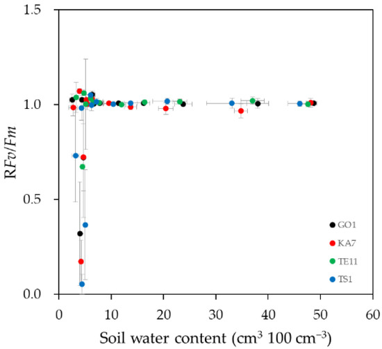 Figure 7. Relationship between the soil water content and RFv/Fm. The black, red, green, and blue symbols correspond to the clones GO1, KA7, TE11, and TS1, respectively.