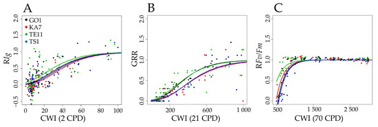 Figure 8. Responses of traits to the Cumulative Water Index (CWI) at the optimum cumulative number of past days (CPD). (A) Response to the CWI at 2 CPD in the stomatal conductance index ratio (RIg) model. (B) Response to the CWI at 21 CPD in the growth rate ratio (GRR) model. (C) Response to the CWI at 70 CPD in the maximum photochemical quantum yield of photosystem (PS) II (RFv/Fm) model. Data points are the measured values, and the curves are the predicted clonal response estimated by the nonlinear mixed-effect model (NLMM) fitted to the Gompertz function (A,B) or the von Bertalanffy function (C). The black, red, green, and blue symbols correspond to the clones GO1, KA7, TE11, and TS1, respectively.
