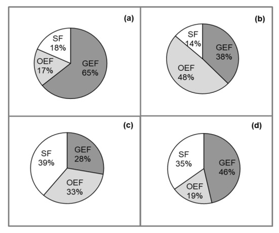 Percentage of generalist entomopathogenic fungi (GEF), opportunistic entomopathogenic fungi (OEF) and other saprotrophic fungi (SF) among the fungi recovered from C. ohridella moths at different stages of development: adult moths (a), eggs (b), caterpillars (c), and pupae (d).