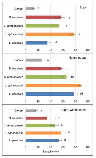 Mortality of C. ohridella eggs, naked pupae and pupae within the mines treated with Lecanicillium aphanocladii, L. psalliotae, Beauveria bassiana and Cordyeps fumosorosea at 3 × 108 conidia/mL concentrations in the sprayed suspension. Data are presented as the mean of five treatments and standard error (SE) (bars). Different letters at columns indicate statistically significant differences (Tukey’s test, p < 0.05).