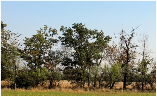 These windbreaks (Figure 7) are functional conditionally as individual elements, not as a system. The individual elements are functional mostly conditionally; according to their spatial parameters, some of them function rather by stopping the wind, with deficiencies in the species composition (about 50% of poplars and box elders) and in the vertical structure of levels, which is not adequately differentiated. The windbreaks contained gaps due to the disintegration of the cover backbone.