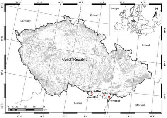 Location of five study localities of the Czech Republic (grey colour indicates forest cover).