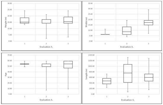 Comparing the median values in category 1 of the A rating, the values were height = 16.0 m, width = 7.0 m, age = 55 years, length = 474.0 m, for category 2: height = 18.0 m, width = 9.5 m, age = 55 years, length = 757.42 m, and for category 3: height = 16.39 m, width = 18 m, age = 55 years, length = 600.0 m.