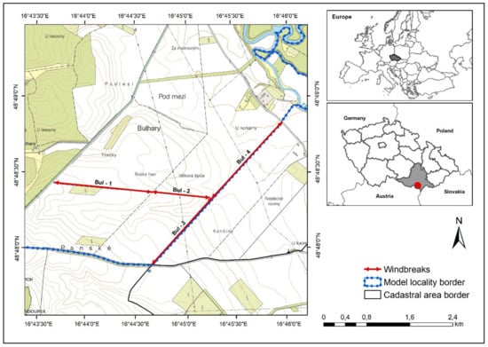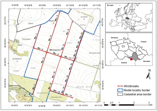 The selection of the study localities was made according to the map of wind erosion risk in the Czech Republic [14]. We selected localities with a permanent risk of wind erosion, in which we identified vegetation barriers (windbreaks): Bulhary, Tasovice nad Dyjí, Micmanice, Hrušky and Tvrdonice (Figure 3). All these localities are situated in planar areas, with Chernozems easily succumbing to wind with erosive effects in a very warm and dry region. The mean annual temperature fluctuates around 9–10 °C, the mean annual sum of precipitation is 500–600 mm, and the probability of dry vegetation periods is 30–50%. Here, the role of windbreaks lies not only in the protection against wind erosion but also in the enhancement of the landscape ecological stability because the localities serve intensive agricultural production, with large blocks of arable land and a minimum of natural biotopes.