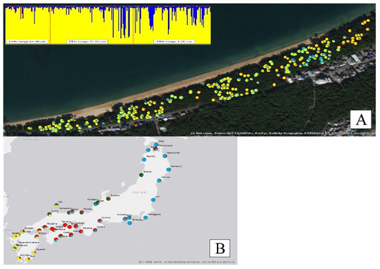 Spatial distribution of genetic structure at Iki-no-Matsubara (A); Iki-no-Matsubara with 42 old populations of P. thunbergii throughout Japan (B).