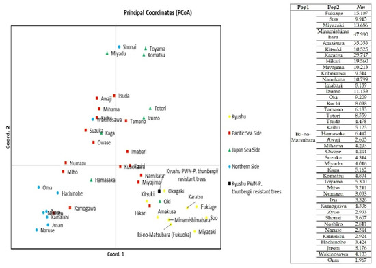 PCoA of Iki-no-Matsubara with other populations of P. thunbergii and the Kyushu PWN-P. thunbergii resistant trees with gene flow (Nm) between Iki-no-Matsubara and the other populations.