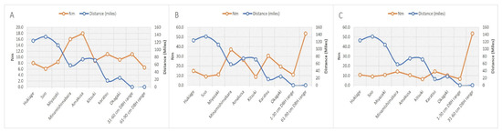 Relationship between gene flow (Nm) and distance with other populations in the Kyushu area on the following basis: (A) 1–30 cm DBH class range; (B) 31–60 cm DBH class range; (C) 61–90 cm DBH class range.