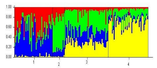 Genetic structure of PWN-P. thunbergii resistant trees on K4 (1) Tohoku region, (2) Kanto region, (3) Kansai region, and (4) Kyushu region.