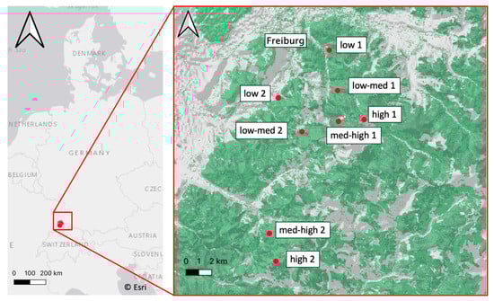 Location of study sites within the Black Forest, southwestern Germany. Plots (red dots) are labelled after their elevational level (low, low-med, med-high, high) and transect number (1 or 2). Digital elevation model provided by [].