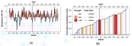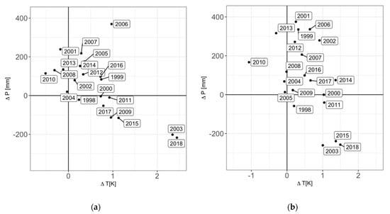 Thermopluviograms depicting annual anomalies of mean annual air temperature (K) and mean annual precipitation sum (mm) from the 50-year observation period for the research area (data source: German NFI environmental data base []). Horizontal baseline stands for mean annual air temperature, vertical baseline for mean annual precipitation sum. (a) Whole year (7.71 °C, 1394 mm); (b) growing period (April–September, 12.72 °C, 729 mm).