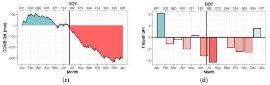 To characterize the climatic conditions in 2018 in detail, we used climatological and meteorological variables as well as drought indices (Figure 3). To explore the thermal anomalies, we calculated the daily difference of the 2018 daily air temperature to the long-term mean (Figure 3a). We identified short and long periods of meteorological drought (Figure 3b). The cumulative climatic water balance (CCWB) was calculated based on Haude [] (Figure 3c). Besides this parameter, we used the monthly Standard Precipitation Index (SPI) to classify and identify droughts [,,,] (Figure 3d). To assess and compare the thermal accumulation of the tree species until the onset of wood formation in spring, we calculated the sum of growing degree days (GDD) using daily minimum and maximum temperatures and set Tbase at 5 °C [].