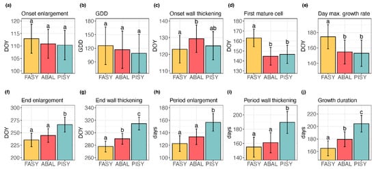Estimated marginal means of the xylem phenology by species (onset enlargement (a), growing degree days (b), onset secondary cell wall thickening (c), onset maturation (d), the day of the maximum growth rate (e), cessation of enlargement (f), cessation of secondary wall thickening (g), the period of enlargement (h), the period of secondary wall thickening (i) and the overall growth duration (j); FASY: Fagus sylvatica, ABAL: Abies alba, PISY: Pinus sylvestris). Error bars indicate 95% confidence levels of estimated marginal means. Different lowercase letters indicate significant differences of the sample means between the tree species (p < 0.05).