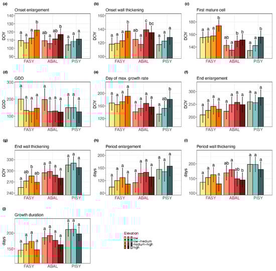 Estimated marginal means of the xylem phenology by elevation and tree species (onset enlargement (a), onset secondary cell wall thickening (b), onset maturation (c), growing degree days (d), the day of the maximum daily growth rate (e), cessation of enlargement (f), cessation of secondary wall thickening (g), the period of enlargement (h), the period of secondary wall thickening (i) and the overall growth duration (j); FASY: Fagus sylvatica, ABAL: Abies alba, PISY: Pinus sylvestris). Error bars indicate 95% confidence levels of estimated marginal means. Different lowercase letters indicate significant differences of the sample means between elevations within each tree species (p < 0.05).