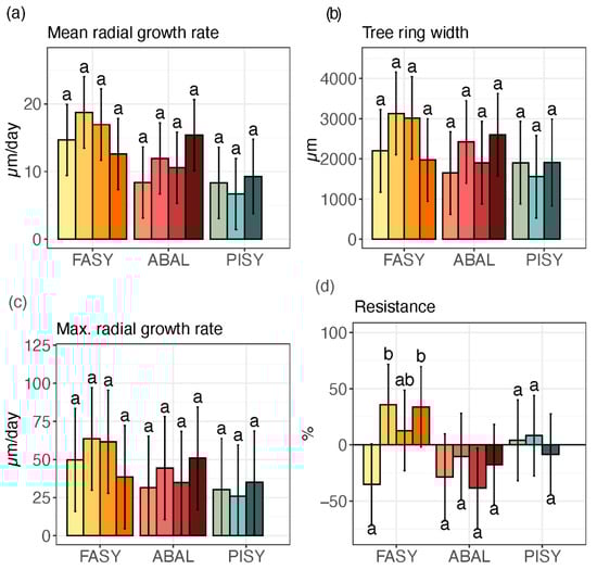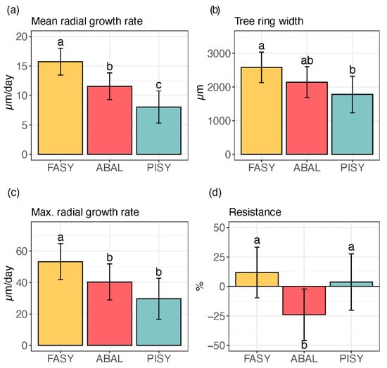 Estimated marginal means of the xylem growth per species (mean daily radial growth rate) (a), tree-ring width (b); maximum daily radial growth rate (c), and the difference between 5-year mean tree-ring width before 2018 and tree-ring width of 2018 (d); FASY: Fagus sylvatica, ABAL: Abies alba, PISY: Pinus sylvestris). Error bars indicate 95% confidence levels of estimated marginal means. Different lowercase letters indicate significant differences of the sample means between the tree species (p < 0.05).
