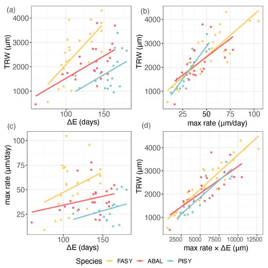 Scatterplots with species-wise linear relationships; (a) tree-ring width (TRW) and radial growth duration (ΔE), (b) tree-ring width and maximum daily growth rate (μm/day), (c) radial growth duration and maximum daily rate, (d) tree-ring width and product of rate and duration.