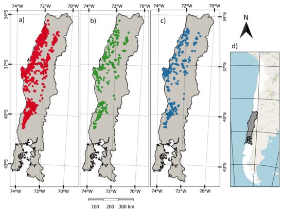 Map of the spatial distribution of observations, showing the location of (a) fitting (n = 48,117), (b) calibration (n = 8036), (c) validation (n = 8037) data sets and (d) Delineation of the study area within the Chilean territory.