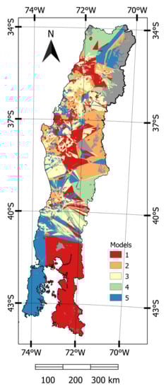 In Chile, different Site Index curves have been developed for each region and geographic area, although these local predictions are relatively inaccurate and there is little understanding of how the Site Index responds to topography, climatic and edaphic conditions []. Given the wide diversity of environmental conditions within the region over which plantations are grown, we assumed that more than one modelling method would be required to best predict Site Index across south-central Chile. Consequently, the objectives of this study were to compare the precision of a wide range of modelling algorithms and determine whether the combination of multiple algorithms (e.g., by the means of spatial ensemble learning) could more precisely predict Site Index than the best performing single modelling algorithm.