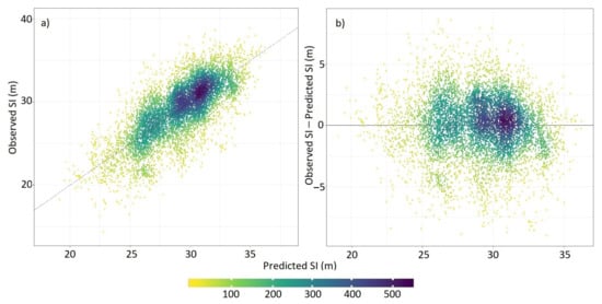 Relationship between Site Index predicted by the ensemble model and (a) observed Site Index and (b) residual Site Index.