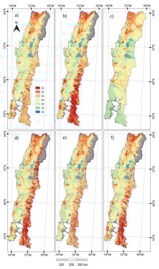 The 64 environmental factors or covariates, as listed in Appendix B, were extracted for each of the plot locations at a 90 × 90 m resolution from spatial layers. These spatial layers described topography, vegetation index, soil properties, and climate. Topography was characterised from a Digital Elevation Model (DEM) that was created using LiDAR. Automated Geoscientific Analyses (SAGA) was used to extract the topographical variables listed in Appendix B from this DEM. The enhanced vegetation index (EVI) was used in order to characterise the vegetation. The values for EVI were derived from MODIS images collected between 1987–2017 period that were reclassified to 90 × 90 m. Values of EVI describing the mean, range, and standard deviation were extracted from this imagery (Appendix B). The soil morphology was determined from the Chilean Natural Resources Information Center (CIREN). The soil properties were determined by interpolating data from ten thousand soil pits that were distributed across south-central Chile that belong to Arauco. The soil surfaces available from this dataset included soil depth, clay content, nutrient content (C:N ratio, N content) and physical properties (available soil water, bulk density, hydraulic conductivity). Long term monthly air temperature, rainfall, evapotranspiration, and water balance were obtained from CR2 (Center for Climate and resilience research []), which is unpublished information, but available for purchase.