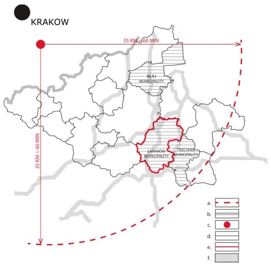 Layout of selected Polish municipalities of the Carpathian Mountains region against the background of the Lesser Poland ecological corridor along with the access isochrone for Krakow. Legend: a—access isochrone for Krakow residents; b—Krakow city limits; c—Krakow city center; d—selected municipalities of the Carpathian Foothills; e—municipality of Łapanów, selected for analysis; f—Lesser Poland ecological corridors—an illustrative course of ecological corridors made on the basis of spatial data prepared under the task “Preparation of a spatial database on ecological corridors in Małopolska—step I” carried out by Regional Directorate for Environmental Protection in Kraków, Department of Nature Conservation and Natura 2000 Areas.