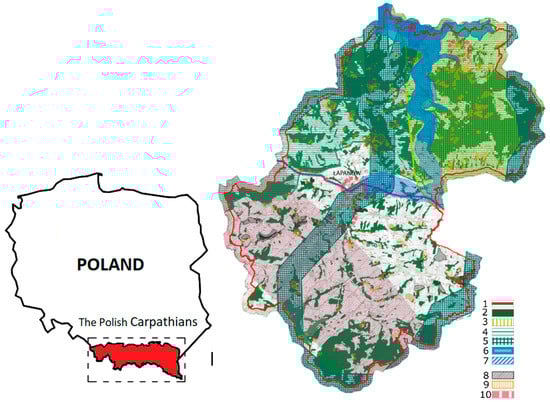 Location of the Carpathian region in Poland (on the left side) and the schema of the Łapanów municipality ecological system with its ecological corridors and major ecosystems marked in green (on the right side). 1—municipality boundary; 2—larger forest ecosystems; 3—natable; 4—Lesser Poland ecological network; 5—Lesser Poland ecological corridor; 6—areas at risk of Figure; 7—local groundwater reservoir “Stradomka”; 8—areas of active landslides; 9—areas of movement of earth masses; 10—selected areas requiring supplementation of green infrastructure.