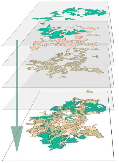 Figure 4 shows a graphical representation of ecosystems for which the coefficients in Tables S1–S4 were calculated. Each layer of a given color constitutes a separate ecosystem and at the bottom all ecosystems are presented as a coherent structure. Light green areas—grassy and scrub ecosystems, green areas-forest and tree-based ecosystems, orange areas-ecosystems of mosaic-like farmland and brown areas—large-scale farmland ecosystems.