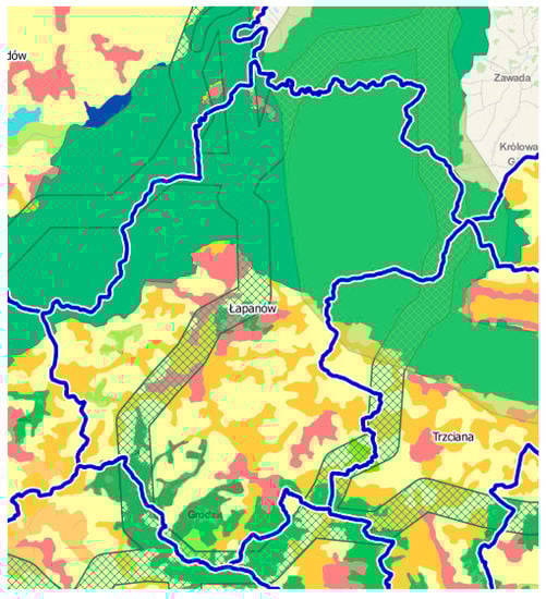To assess whether countering green infrastructure fragmentation is reflected local law, we analyzed planning documents of the municipality of Łapanów in terms of protective provisions applying to the natural environment []. The results of this analysis are shown in Table 3.