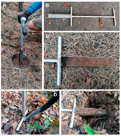 On each plot, 16 sampling sites (as 16 replicates) were located in a square grid (2 m distance between sampling sites) to quantify the variability within the plot and to get reliable data for the comparison of the results of various sampling techniques. In each sampling site, three samples were collected for further analyses. Forest litter (L) was collected using a stainless-steel cylinder frame (diameter 20 cm). The natural thickness of litter was noticed in each sampling site after averaging of at least five measurements. After litter sampling (i.e., complete removal of the organic layer within the frame), the mineral topsoil (T) was sampled from the depth 0–25 cm (as required by [49]) using the gouge auger (diameter 5 cm, working length 30 cm) provided by Eijkelkamp (Figure 1A). This means the “zero depth” for the T sample was at the mineral soil surface, and the sample consisted of the mineral topsoil only. In the direct neighborhood of the frame, the joint litter + topsoil sample (TLs) was collected from the depth 0–25 cm, where the “zero depth” was at the surface of the litter layer, using a 25 cm long stainless-steel sampler, 5 × 5 cm in cross section (Figure 1B,C). The sampler had (a) a flat, horizontal upper wall of the working section, which compacted the litter layer during sampling, and (b) a transverse bar welded directly above the working section of the sampler, which controlled the depth of sampler insertion (Figure 1B). The edges of the sampler walls were tightly sharpened to precisely cut the litter, irrespectively of the structure of the organic matter (important in the case of fibrous litters). The rotation of the sampler inserted into the soil was impossible because of its square cross-section. Thus, after complete sampler insertion, the standard spade (at least 25 cm long) was driven to soil along the open (front) wall of the sampler to cut the sampled soil and to dig the free space in front of the sampler (Figure 1D), which allowed sampler tilting and safe removal without any loss of the collected sample (Figure 1E). Typically, the sampler was fully inserted “manually” (in fact using the leg pressure on the lower crossbar as a footstep) to the depth of 25 cm. However, in some dry silty soils, the use of hammer was necessary to reach the last 2–3 cm (the use of hammer was typically required to insert the gouge auger without the footsteps, Figure 1A). The sampler construction is currently under the patent application procedure in the Patent Office of Poland.
