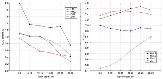 SOC and pH in subsequent sublayers of the mineral topsoil layer in the plots under study.