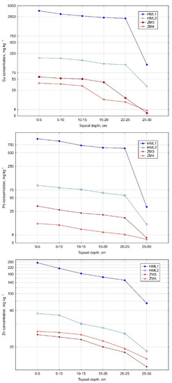 Soils selected for a comparative analysis significantly differed in texture, physicochemical properties, and contamination level. All soils were arable before their afforestation in the 1980s–1990s, thus thick (22–26 cm) plough layers were still easily recognizable in the profiles by their sharp (HML1 and HML2 plots) or clear (ZM3 and ZM4 plots) transition to subsoil. Soils of the plots HML1 and HML2 had the texture class of silt loam: in ZM3, sand, and in ZM4, loamy sand (Table 1). The SOC content was differentiated in the topsoil layers, i.e., was noticeably uplifted in the sublayer 0–5 cm in all plots and then subsequently decreased with depth, excluding the plot HML1, where SOC content was relatively stable below the depth of 5 cm until the depth of 20–25 cm (Figure 2). The decrease of SOC was abrupt or at least more rapid below the depth 20 or 25 cm, i.e., below the former ploughing limit. Soil pH was neutral or slightly alkaline and relatively stable throughout the topsoil layer in the plots HML1 and ZM4, slightly increasing with depth in ZM3 and noticeably increasing with depth, i.e., clearly acidified in the near-surface sublayers, in HML2 (Figure 2). The topsoil contamination with Cu and Pb in the plots under study was in the following order: HML1 >> HML2 > ZM3 > ZM4. For Zn, it was HML1 >> HML2 > ZM4 > ZM3 (Table 1). In all cases, it decreased with depth (please note the logarithmic scale of Y axis) (Figure 3). The largest decrease (often abrupt) was documented directly below the depth of 25 cm, which may have a significant influence on the results of topsoil contamination assessment at different sampling depths.