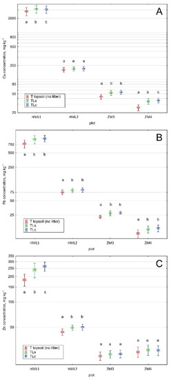 Comparison of (A) Cu, (B) Pb, and (C) Zn concentrations in the mineral topsoil layer 0–25 cm collected without litter (T), in the jointly collected litter + mineral topsoil layer 0–25 cm (TLs), and calculated for the topsoil layer 0–25 cm from separately analyzed litter and mineral topsoil (TLc). Central square indicates the mean value, box—the standard error, whiskers—the standard deviation. Letters a, b designate the homogeneous groups of means checked by NIR-Fisher test (on each plot separately).