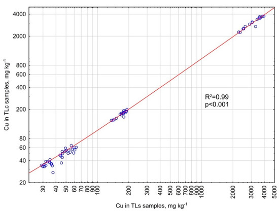 Correlation between Cu concentrations in TLs (topsoil layer 0–25 cm, litter and mineral topsoil sampled jointly) and TLc (calculated data for topsoil layer 0–25 cm, where the litter and mineral topsoil were sampled separately).