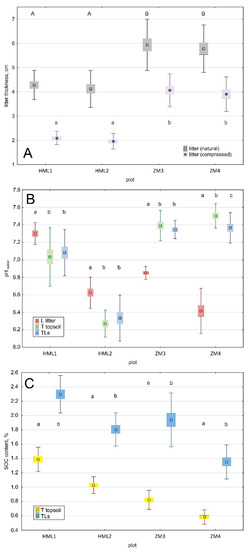Comparison of the measured variables in the plots under study: (A) natural thickness of forest litter layers and thickness of the litter compressed during sampling (TLs samples), (B) pH of the litter layer (L), mineral topsoil layer (T), jointly collected litter+mineral topsoil layer (TLs), (C) SOC content in the mineral topsoil layer (T) and jointly collected litter+mineral topsoil layer (TLs). Central square indicates the mean value, box—standard error, whiskers—the standard deviation. Letters A, B, a, b designate the homogeneous groups of means checked by NIR-Fisher test.