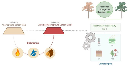 One straightforward way of addressing the consequences of disturbance in forest AGB is by integrating geospatial techniques with remote sensing and process-based forest growth models [36,37]. Specifically, remote sensing and GIS technologies allow the assessment of forest AGB at broad scales [38] whereas process-based forest growth models can provide insights on the mechanisms and processes involved in forest recovery and their relationship with spatiotemporal climate (including human)-induced scenarios. Models can help in assessing the recovery time of vegetation using climatic variables to predict vegetation productivity and its spatial variability [38]. At a regional scale, net primary productivity (NPP) is often used as an indicator of inherent plant growth potential [39]. Several studies have indeed assumed a strong relationship between productivity and biomass [40] with the first one being a function of the second. Indeed, the targeted parameter AGB is also influenced by climate, water availability and soil fertility [39,40,41]. In this study, we assessed the recovery time (i.e., the time necessary for a forest to recover its pre-disturbance AGB levels) of Brazilian Amazon forests AGB from drought, fire and a combination of logging and fire disturbances, using a dynamic forest carbon model that simulates vegetation recovery time as a function of climate scenarios and geospatial data. With the present study, we aim to investigate the recovery time of AGB in the Amazon forests when subject to a disturbance caused by: (1) an extreme drought, (2) a catastrophic fire and (3) a combination of logging and fire disturbances by integrating the existing knowledge [24,42,43,44] within our modeling framework.