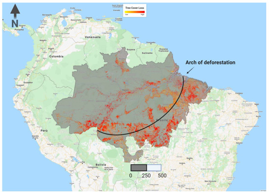 Study area: Amazonian forest in Brazil. Amazon biome extent (gray area). Forest loss map (yellow-red) has been displayed according to [45,46] (Global Forest Change dataset in Google Earth Engine). Red pixels identify areas of where tree cover loss has been detected.