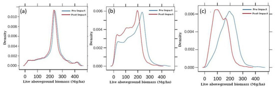 Biomass density plots describing patterns before and after drought (a), fire (b) and logging + fire (c) impacts. Only areas that burned between 2003 and 2016 are considered and, for (c), only burned areas up to 3 km from logging areas. Recovery is defined as 100% of pre-disturbance AGB.