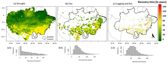 Aboveground recovery time (in years) for 2010 drought (a), fire areas that burned between 2003 and 2016 (b) and in areas that were both burned and logged (c). Histogram plots summarize AGB recovery pixels distributions (in years), for drought (a1), fire (b1) and logging + fire (c1).