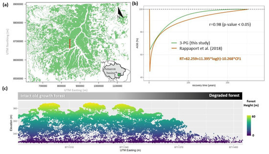 Light detection and ranging (Lidar) remote sensing is widely used for monitoring forest structure and biomass dynamics [69,70] in many forest ecosystems [71]. For instance, airborne lidar (ALS) technologies help quantify changes in canopy structure, carbon stocks and recovery time at the local-to-regional scale under different types of forest degradation (e.g., [25,72,73]).