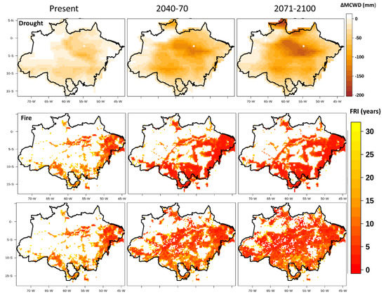 Projected changes in droughts (as maximum climatological water deficit anomalies, ΔMCWD) (upper panel) and fire return interval based on an optimistic land use scenario (mid panel) and in the unmitigated scenarios with the worst-case land-use scenario (bottom panel).