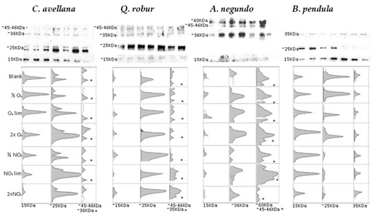 The behavior for the band around 35–36 KDa changed depending on the species. For C. avellana and Q. robur, NO2 was the only gas with visible influence but with contrary effect, decreased expression in the first case and increased in the second one. For B. pendula, O3 had a minor effect decreasing the band expression while NO2 induced a small increase. Finally, for A. negundo pollen, both gases induced an increased expression, but no expression was observed at the highest NO2 concentration.