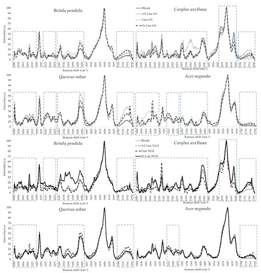 Average Raman spectra of A. negundo, B. pendula, C. avellana and Q. robur pollen, exposed for 6 h to O3 (upper figure) and NO2 at concentrations corresponding to half the limit (1/2), the limit (Lim) and the double limit (2 × Lim) values for the protection of vegetation according to the EU Directive 2008/50/EC on ambient air quality and cleaner air for Europe. The grey squares highlight the regions where visible changes occur.