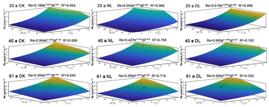 | Rs (μmol·m−2·s−1) | Soil Temperature (°C) | Soil Water Content (%) | ||||
