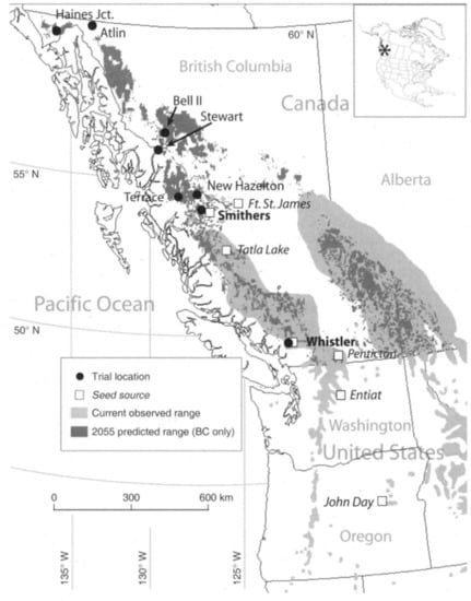 Climate change is expected to decouple forest tree populations from the climates to which they have become locally adapted over many generations [1,2,3,4]. Local adaptation can involve critical trade-offs; frequently, populations from colder sites are more frost resistant, although they have less growth potential than populations from warmer locations that have genetically extended growing seasons [5,6,7], and populations from drier locations may be more drought resistant or tolerant [8,9]. Suitable climatic habitat for given biomes, tree species, and their populations is predicted to occur at more polar latitudes and higher elevations as climate change progresses [10,11,12,13,14]. Indeed, natural migration of some tree populations via seed dispersal to more polar latitudes and higher elevations has already been observed [15,16,17], although this is not happening at the speed needed to keep populations coupled with the climatic habitat to which they have evolved. Such ongoing decoupling is creating increasing stress for tree populations. Perhaps most evident is drought stress, which makes trees weaker and less able to defend against insect and pest attacks [18]. This cascade of abiotic and biotic stresses is resulting in massive mortality of tree populations around the world [19,20,21]. The largest negative impacts will likely happen at the rear-edge (lower latitudinal, elevational, or xeric limit) of the natural distribution of each tree species [22,23,24,25].