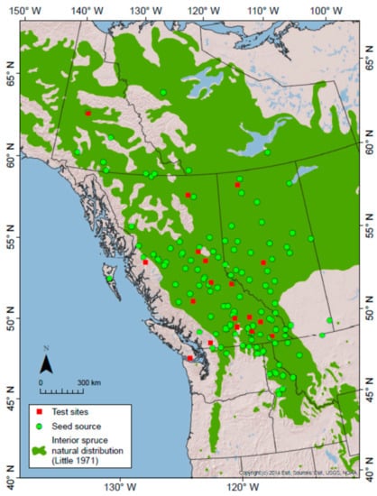 As Picea glauca (Moench) Voss, Picea engelmannii Parry ex Engelm., and their hybrids (known locally as interior spruce, but herein referred to as Picea glauca × engelmannii) are among the most ecologically and economically important species in BC and throughout Canada [55], a large, long-term field provenance trial of Picea glauca × engelmannii was established by the BC government in 2005. The trial consisted of 128 natural stand populations and orchard seedlots from Canada and USA planted at each of 17 sites in BC, Yukon, and Alberta. Details regarding the populations, test sites and experimental design can be found in O’Neill et al. [56] (Figure 2).