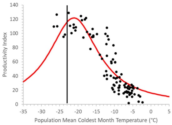 Genecology function for a provenance test site near the town of High Level, Alberta, showing that the most productive populations at the High Level site are those that originate from locations having a mean coldest month temperature (MCMT) approximately 3 °C warmer than the plantation. The vertical bar identifies the MCMT of High Level, Alberta (−23 °C).
