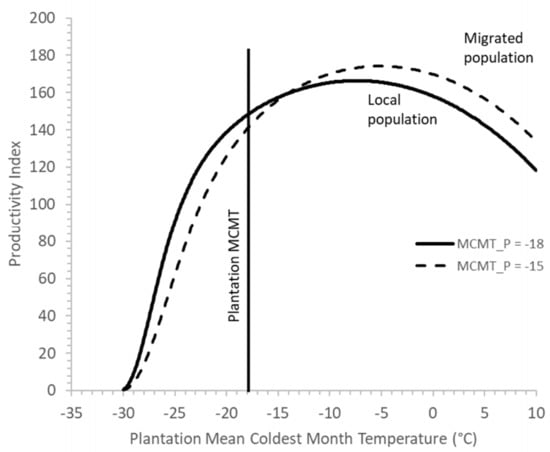 Comparisons of the modelled trajectories of population productivity over time show that productivity is slightly greater for the local than the migrated population at establishment (i.e., when plantation MCMT = −18 °C); however, shortly after establishment (i.e., when plantation MCMT ≈ −15 °C), the relative productivity of the migrated population surpasses that of the local population, suggesting that assisted migration can help mitigate climate change impacts to productivity (Figure 4). Where forest productivity is low or long-lived plantations are desired (as in many conservation situations), the increasing advantage of migrated populations over time can be particularly valuable.