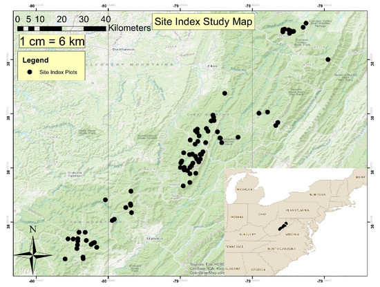Map of the plots where site index sampling occurred. Sampling was conducted on the Monongahela National Forest in West Virginia.