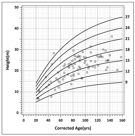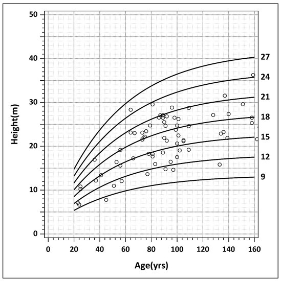 - Meyer, H.A. A Mathematical Expression for Height Curves. J. For. 1940, 38, 415–420. [Google Scholar]